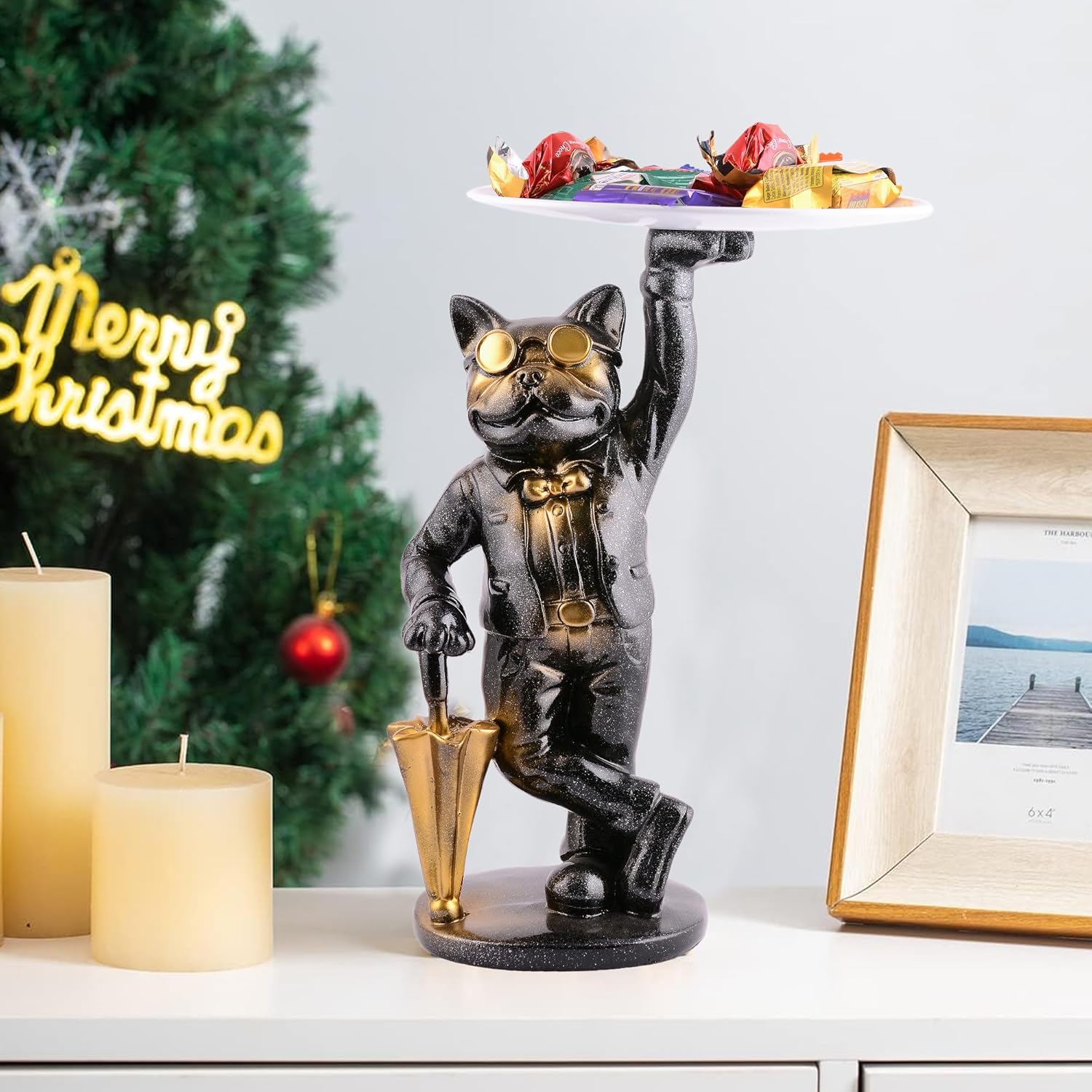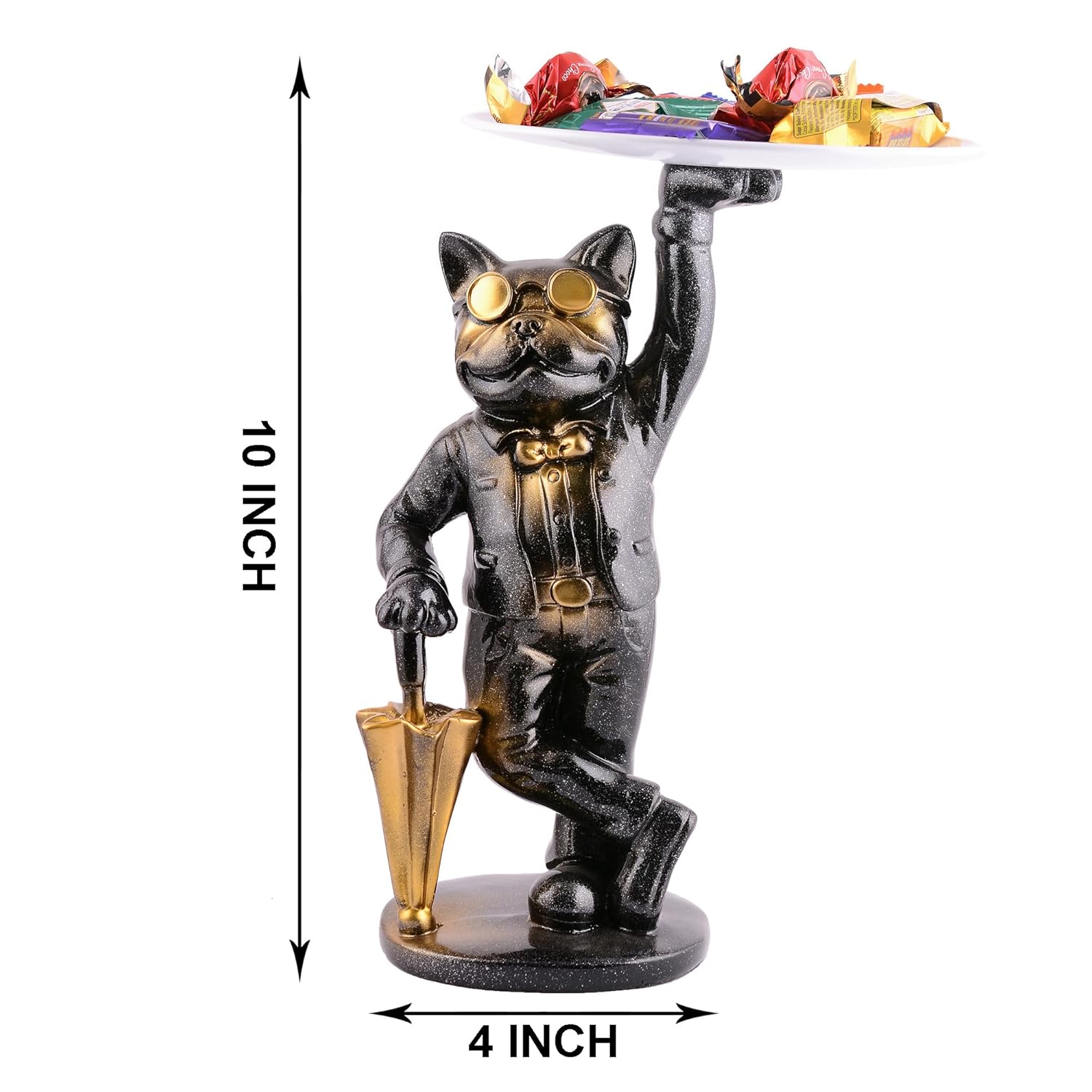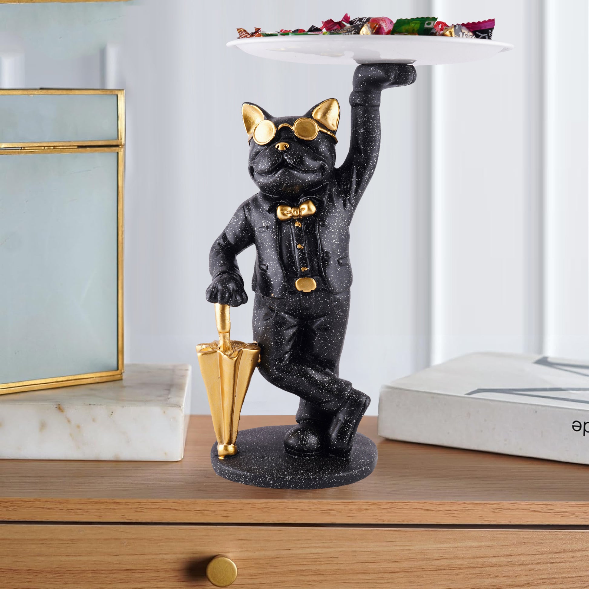 - DESIGN FEATURES: Charming cat butler statue holding a serving tray, adorned with golden spectacles and bow tie