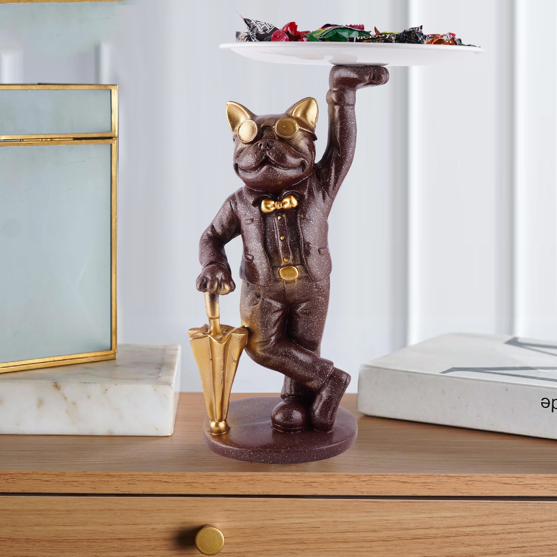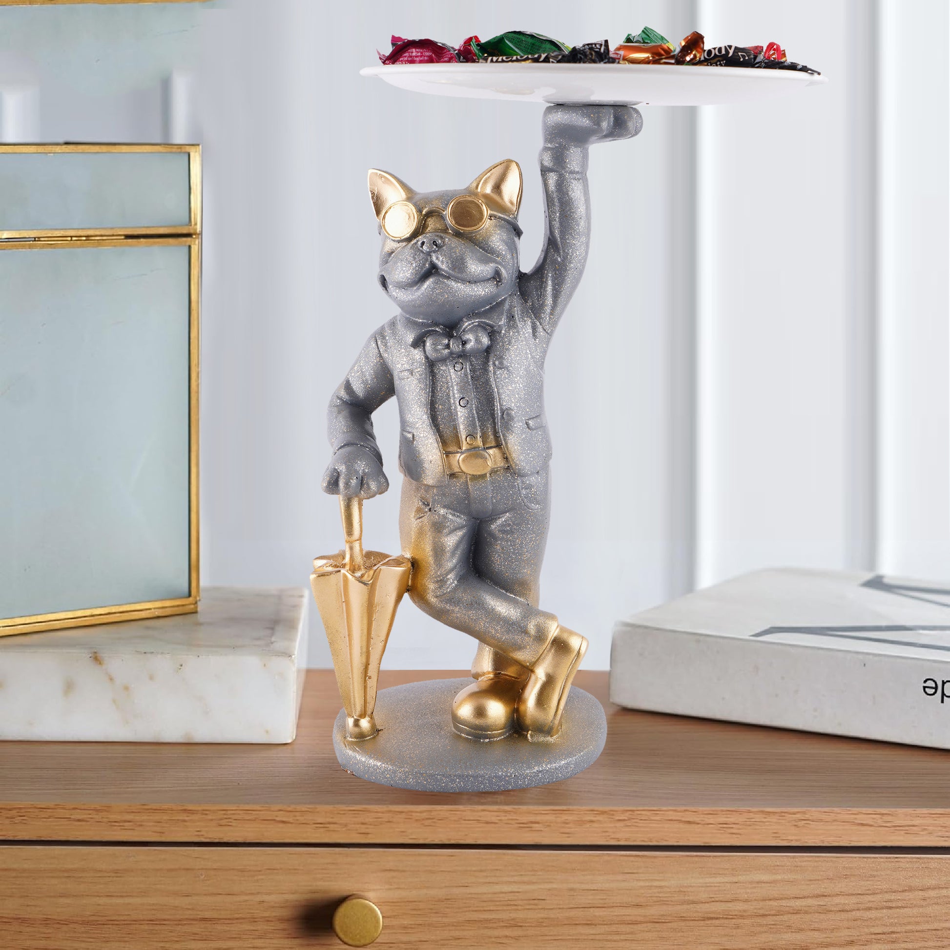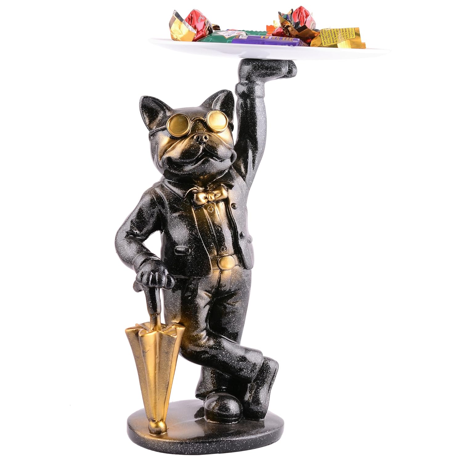 - DESIGN FEATURES: Charming cat butler statue holding a serving tray, adorned with golden spectacles and bow tie