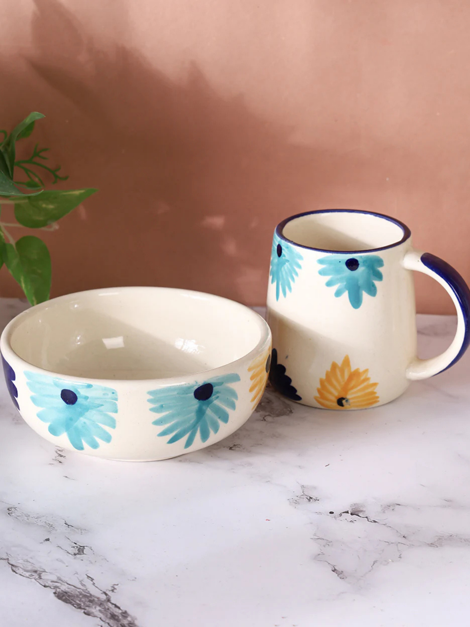 - Handcrafted ceramic mug and bowl set with floral hand-painted design 🌼