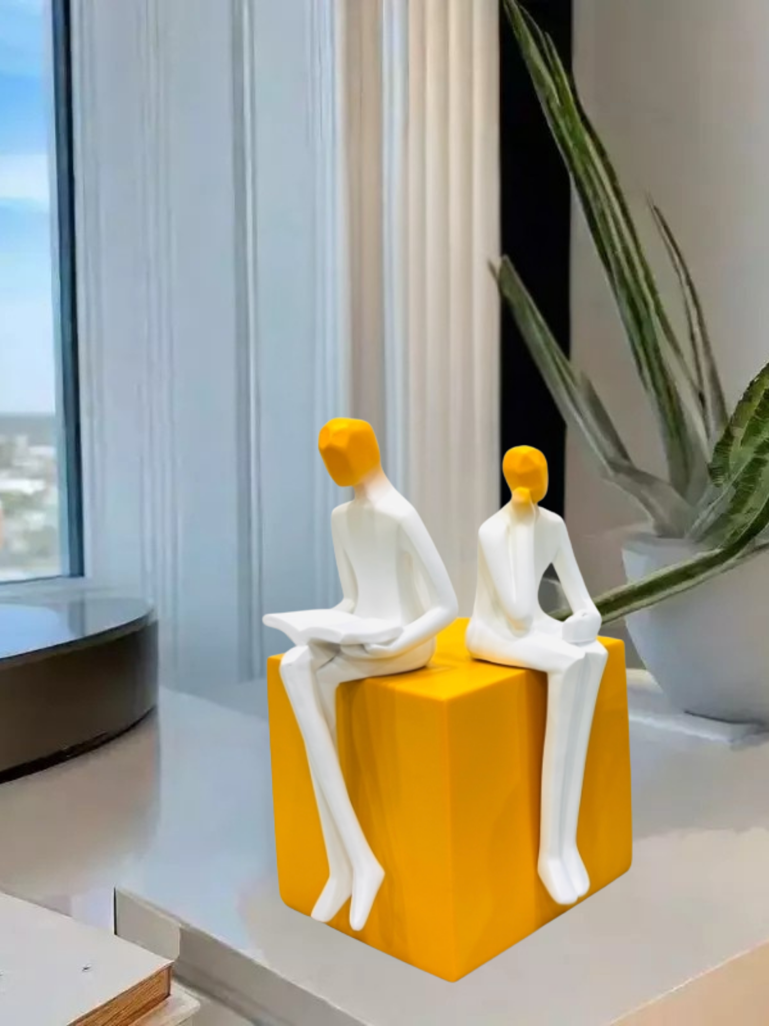 - Set on a bold mustard-yellow cube base, adding a pop of colour and contemporary charm.