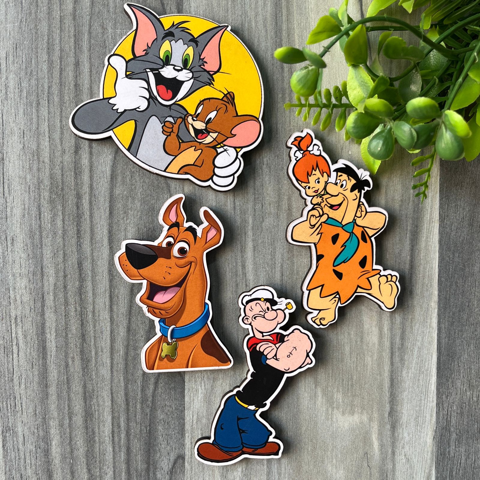 - Bring a dose of nostalgia to your home with this fun magnet set featuring beloved classic cartoon characters. The set includes four scratch-proof magnets showcasing Tom & Jerry, Scooby-Doo, Fred Flintstone with Pebbles, and Popeye. Made with high-quality materials, these magnets are gentle on surfaces, ensuring they won’t leave scratches on your fridge or magnetic board. A perfect gift for cartoon lovers or a playful addition to your kitchen decor.