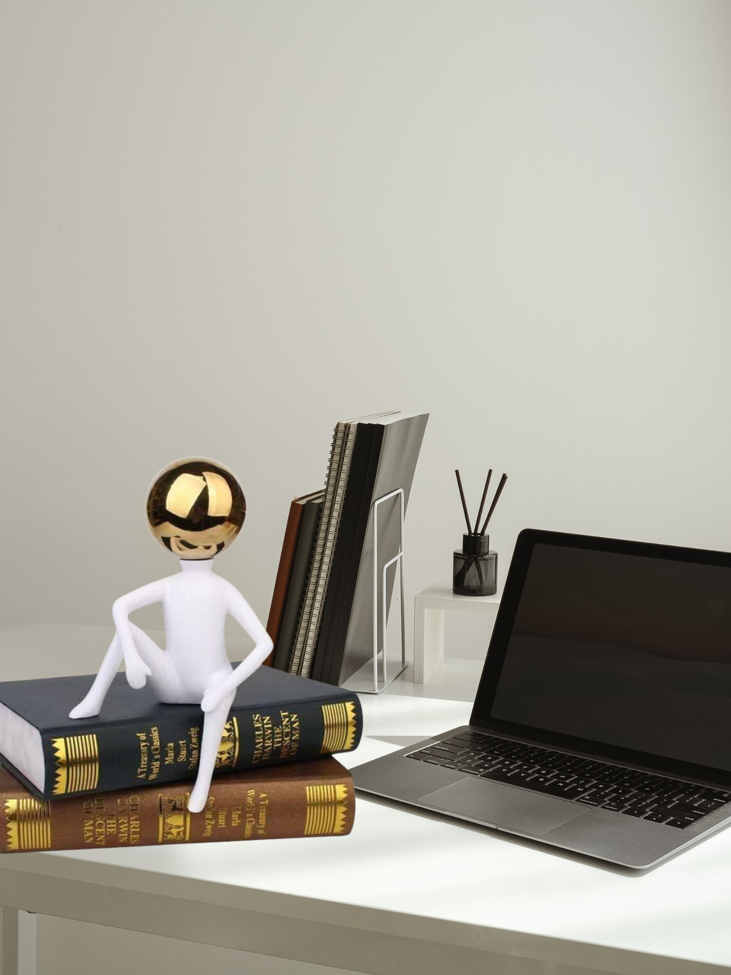 - Elegant modern showpiece featuring a matte white human form with a polished gold spherical head, symbolising thought, balance, and intellect