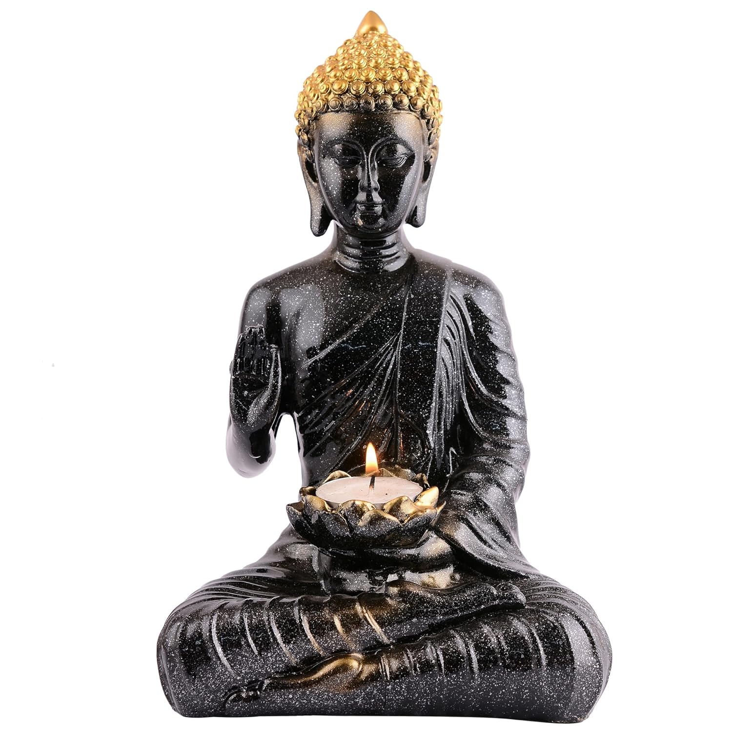 - CANDLE HOLDER: Integrated lotus-shaped candle holder in the statue's hands adds a serene ambiance when lit